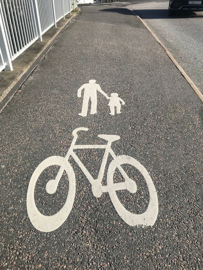 Kompositionen betyder naturligtvis att banan är till för både gång och cykling. Men den inbördes placeringen av de två symbolerna verkar vilja påverka vår tolkning mer än så, eller bara styra vårt beteende utan att vi tänker på det. Flera olika tolkningar är möjliga:
