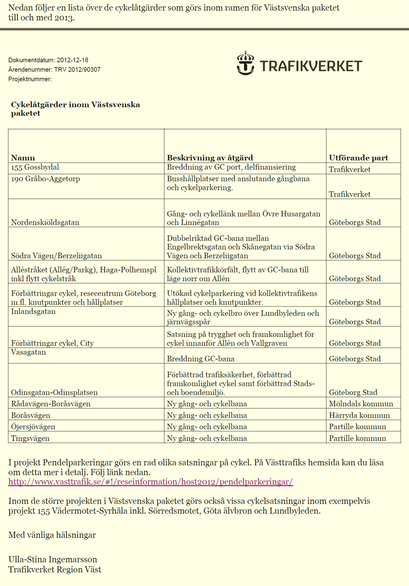 Jag såg en annons om från Nya Vägvanor i Faktum i december. Bland annat skrevs det m a p det västsvenska paketet att det är ”mycket på gång”: ”Nya cykelbanor och pendelparkeringar ska göra det lättare att variera sig.” Mejlade ett önskemål om en lista på alla nya cykelbanor som byggs som en del av det västsvenska paketet. Här är svaret (från Trafikkontoret, 2012-12-17):